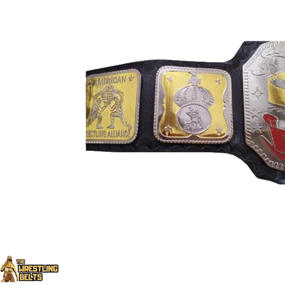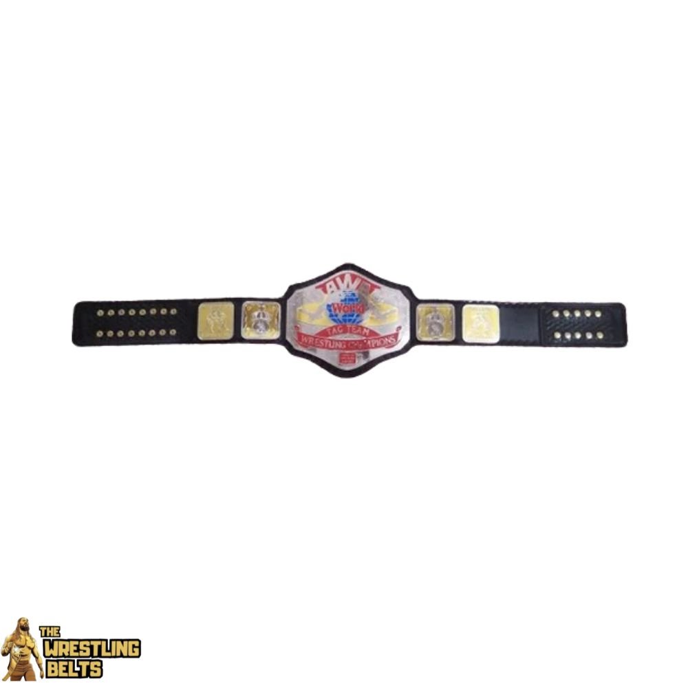 Celebrate the iconic legacy of tag team wrestling with the AWA World Tag Team Replica Title Replica Belt, a meticulously crafted championship belt that honors the legendary tag teams who defined an era of wrestling excellence. This full-size replica features beautifully gold-plated center and side plates showcasing intricate engravings of the American Wrestling Association (AWA) logo and classic tag team motifs. Mounted on a thick, durable black leather strap with reinforced stitching, this belt perfectly balances authenticity, durability, and display appeal. Its realistic weight and dimensions make it a prized possession for collectors, wrestling enthusiasts, and fans of tag team competition worldwide.