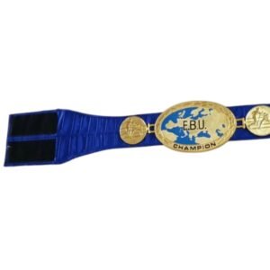 The EBU Championship Boxing Belt represents the pinnacle of European boxing competition. This high-quality replica mirrors the official European Boxing Union title belt, featuring a rich blue leather strap and a gold-plated centerpiece engraved with the EBU crest. The detailed enamel work, combined with ornate scroll patterns, gives this belt a striking appearance. Side plates depict boxing gloves and laurel wreaths, symbolizing victory and sportsmanship. Built for authenticity, this belt is ideal for boxing events, championship awards, and collectors seeking rare international titles.