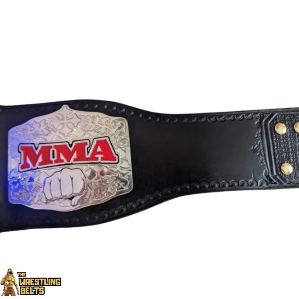The MMA Wrestling Championship Replica Title Belt merges the worlds of mixed martial arts and professional wrestling in a single stunning design. The strap is made from durable faux leather, polished to a premium finish, and equipped with strong snap fasteners. The gold-plated centerpiece features dual combat silhouettes, surrounded by intricate scrollwork and enamel accents. The side plates feature alternating MMA cage and wrestling ring designs, making this belt a unique collectible for fans of both sports. Perfect for promotional events, tournaments, or as the ultimate trophy for hybrid combat competitions.